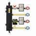W sprzęgle hydraulicznym wbudowana jest zwrotnica przepływu - kieruje strumienie zasilające i powrotne pod odpowiednie króćce, zapewniając prawidłowy rozkład temperatur na wszystkich obiegach grzewczych, niezależnie od ich typu. Przy tym rozwiązaniu nie występuje efekt "wciągania" większości gorącego czynnika przez pierwszy króciec zasilający, co w układach bez tego rozwiązania często powoduje problemy z osiągnięciem zadanych temperatur na zasileniach pozostałych obiegów. Przyłącza od strony źródła ciepła i instalacji - 1" GW.